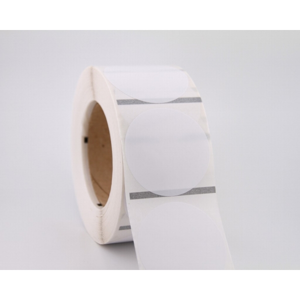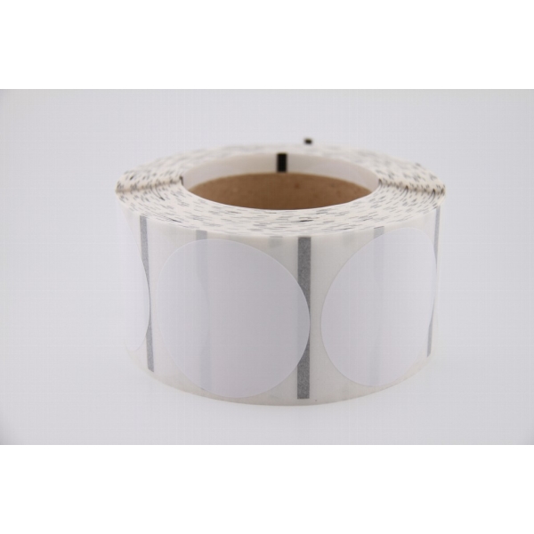Rollo de etiquetas 75×75 mm, Papel Blanco Brillo Inkjet, Adhesivo Permanente, Circular 75, Rollos de 425 etiquetas. Presentación bobinas: Pequeña – Ext 40 127