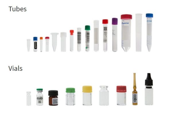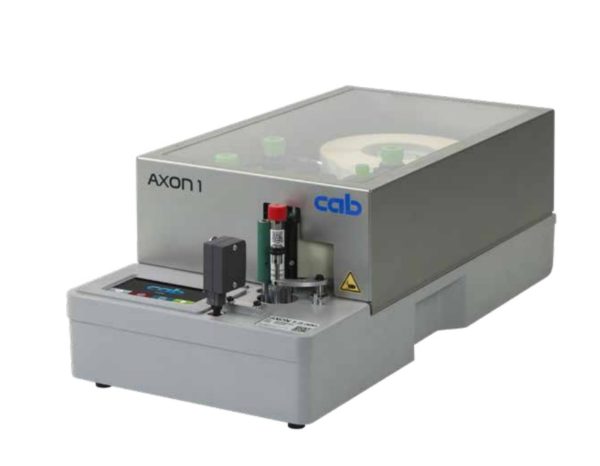 Impresora y aplicadora automática de etiquetas para tubos y viales.