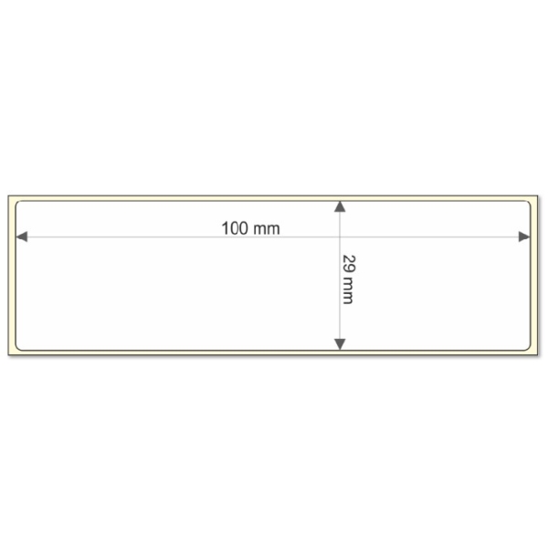 Rollo de etiquetas 100×29 mm, Pp Blanco Brillo Inkjet, Adhesivo Permanente Muy Fuerte, Rectangular Cantos Romos , Rollos de 1.000 etiquetas. Presentación bobinas: Pequeña – Ext 40 127