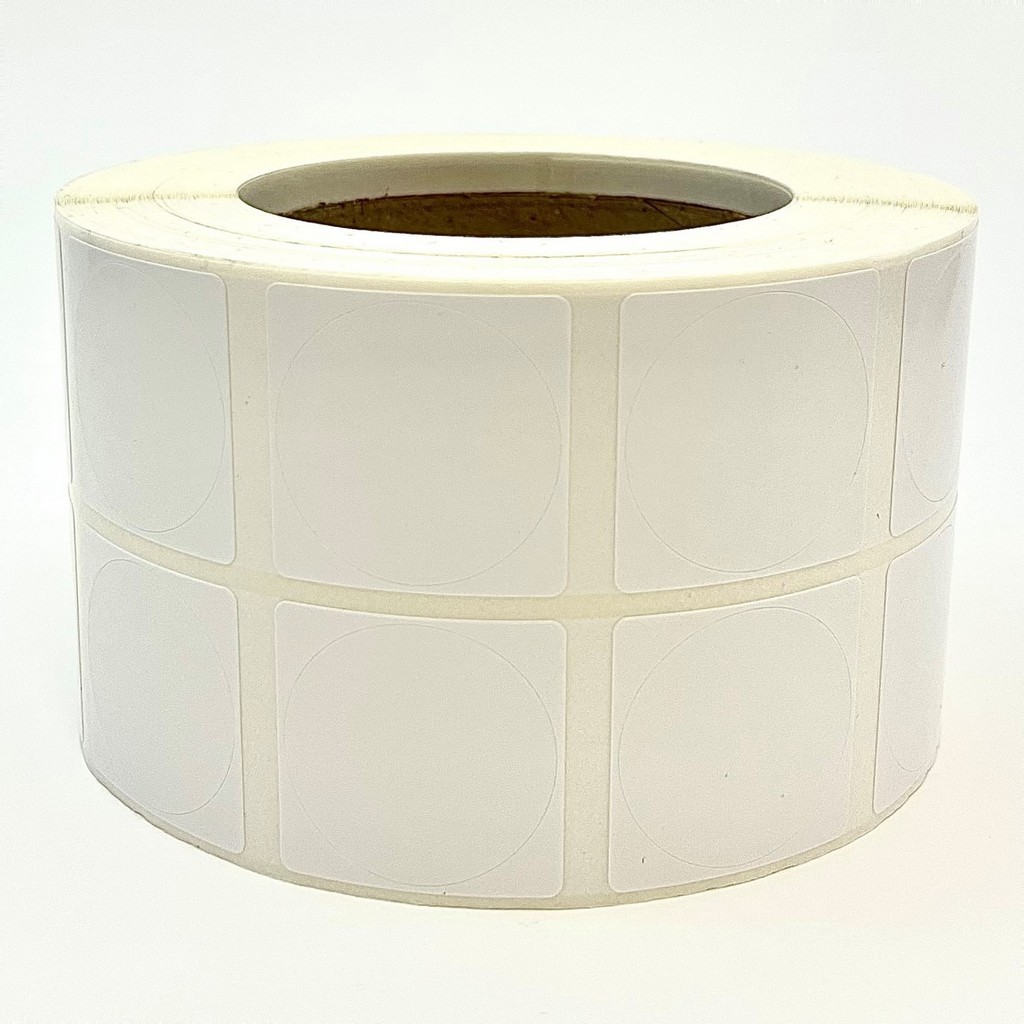 Rollo de etiquetas 34×34 mm, Papel Blanco Brillo Inkjet, Adhesivo Permanente, D Circular-Cuadrada 32, Rollos de 3.000 etiquetas. Presentación bobinas: Mediana – Ext 76 152
