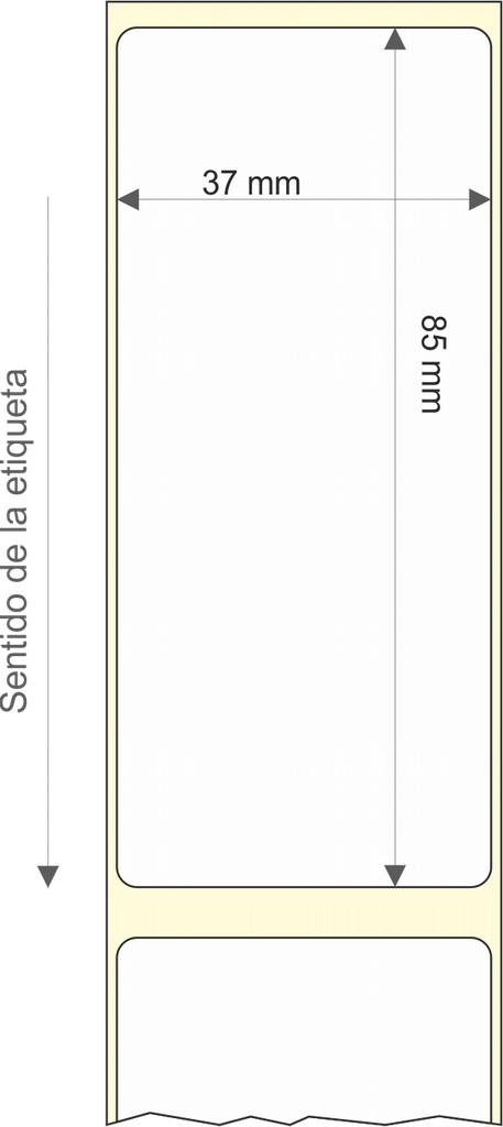 Rollo de etiquetas 37×85 mm, Polipropileno Bco Brillo Ink, Adhesivo Permanente, Rectangular Cantos Romos , Rollos de 800 etiquetas. Presentación bobinas: Mediana – Ext 76 152