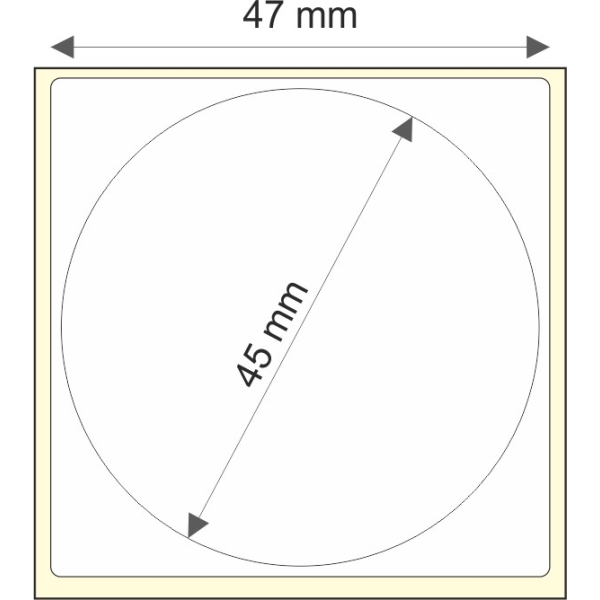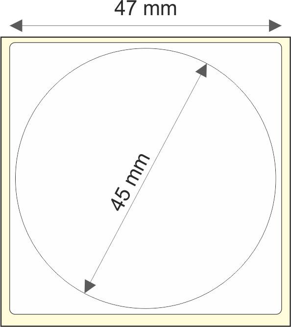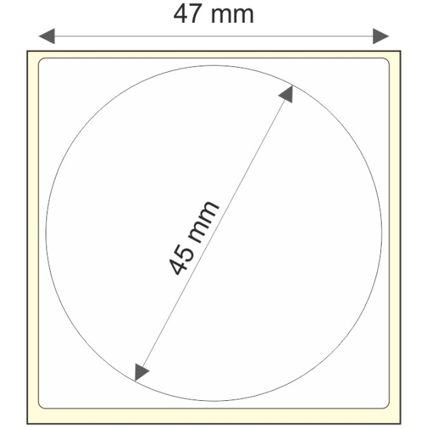 Rollo de etiquetas 47×47 mm, Papel Blanco Brillo Inkjet, Adhesivo Permanente, D Circular-Cuadrada 45, Rollos de 1.500 etiquetas. Presentación bobinas: Mediana – Ext 76 152