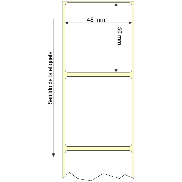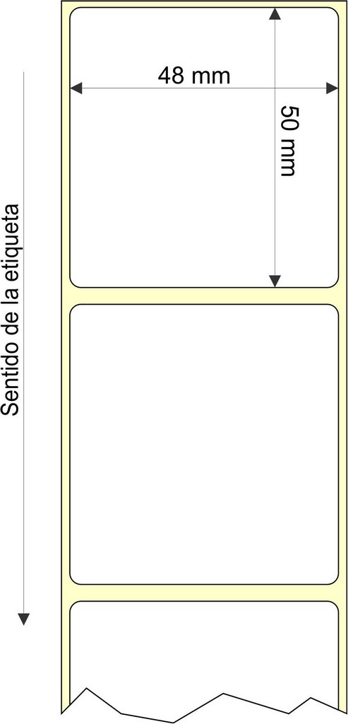 Rollo de etiquetas 48×50 mm, Papel Blanco Semibrillo Inkjet (Couche), Adhesivo Permanente, Rectangular Cantos Romos , Rollos de 1.300 etiquetas. Presentación bobinas: Mediana – Ext 76 152