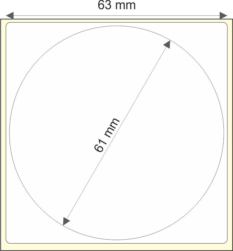 Rollo de etiquetas 63×63 mm, Papel Blanco Brillo Inkjet, Adhesivo Permanente, D Circular-Cuadrada 61, Rollos de 500 etiquetas. Presentación bobinas: Pequeña – Ext 40 127