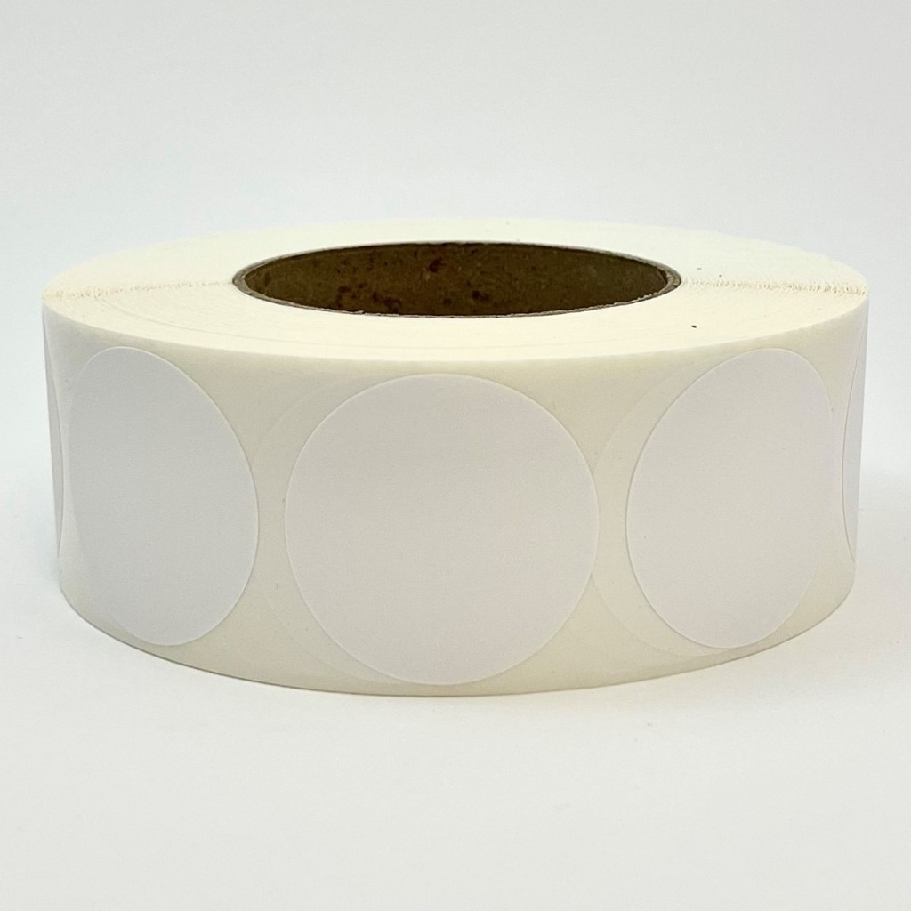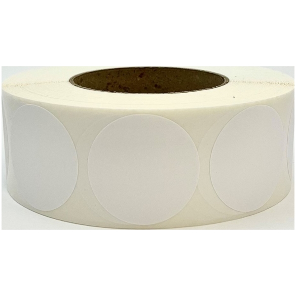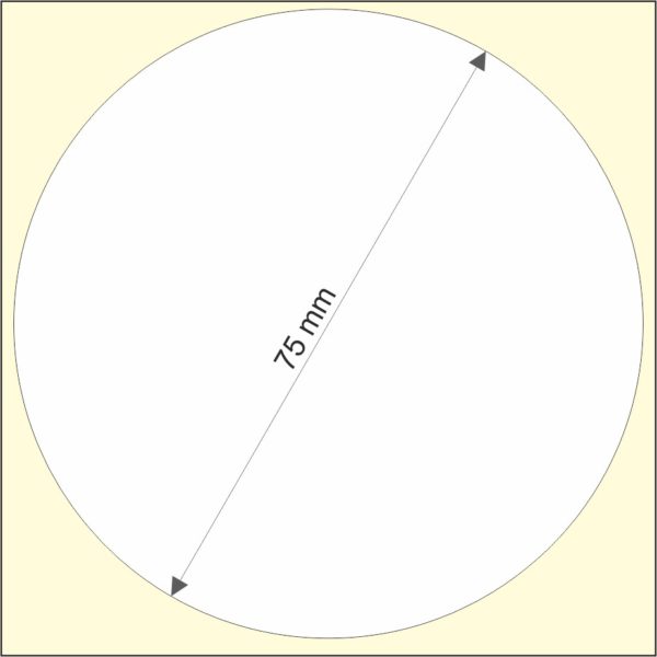 Rollo de etiquetas 75×75 mm, Papel Blanco Brillo Inkjet, Adhesivo Permanente, Circular 75, Rollos de 850 etiquetas. Presentación bobinas: Mediana – Ext 76 152