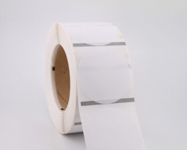 Rollo de etiquetas 75×75 mm, Papel Blanco Brillo Inkjet, Adhesivo Permanente, Circular 75, Rollos de 425 etiquetas. Presentación bobinas: Pequeña – Ext 40 127